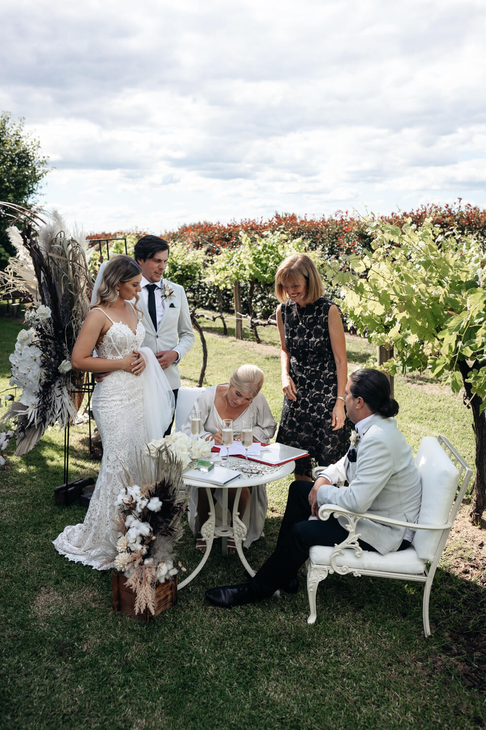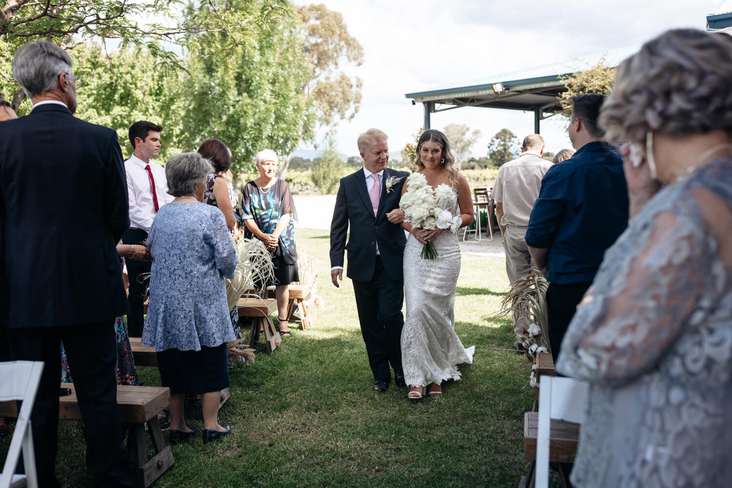 Wedding Venue: Blue Wren Farm, Mudgee | Celebrant: Tie the Knot | Make-up artist: Bella Medi Spa | Hair stylist: Chevaux Studio | Floral designer: Mudgee Monkey | Videographer: Foreground | Cake designer: Who Ate The Cake | Live Music & DJ: Divine Productions | Bride’s dress: Made With Love | Bride’s shoes: Grace Loves Lace | Brides ring designer: St Germain Jewellers – engagement ring / Robert Cliff Master Jewellers – wedding band | Groom’s suit: Politix
