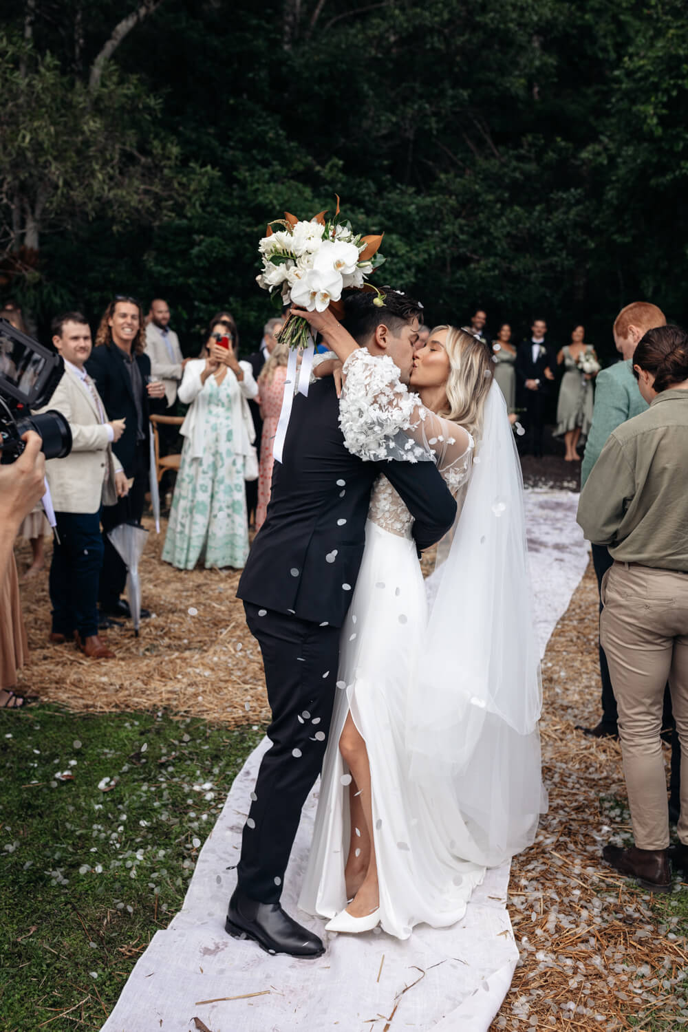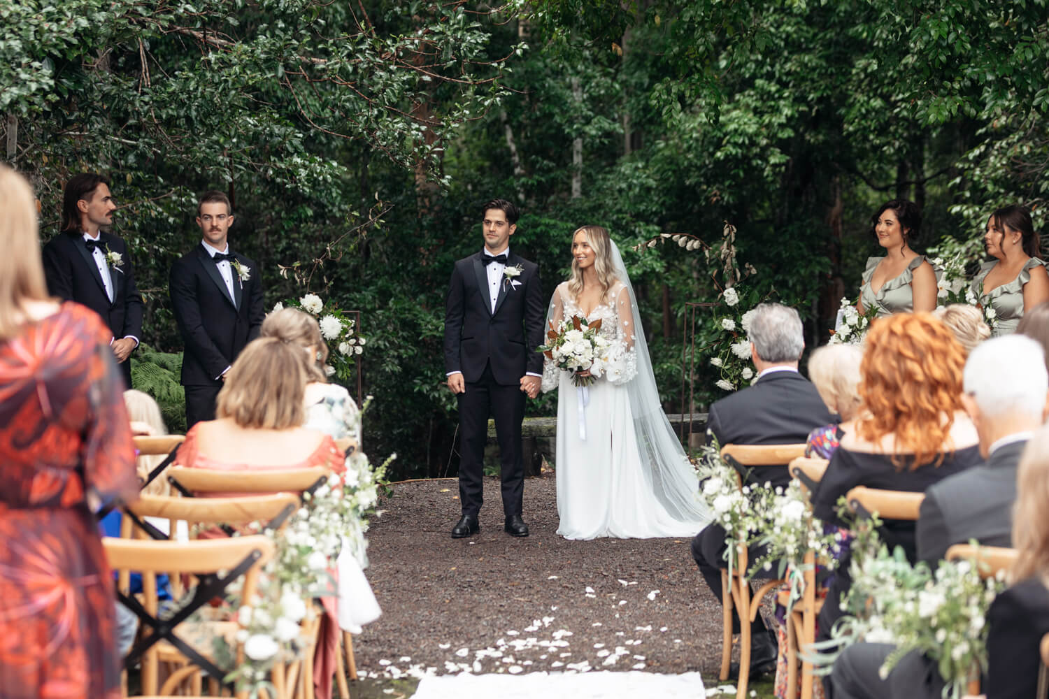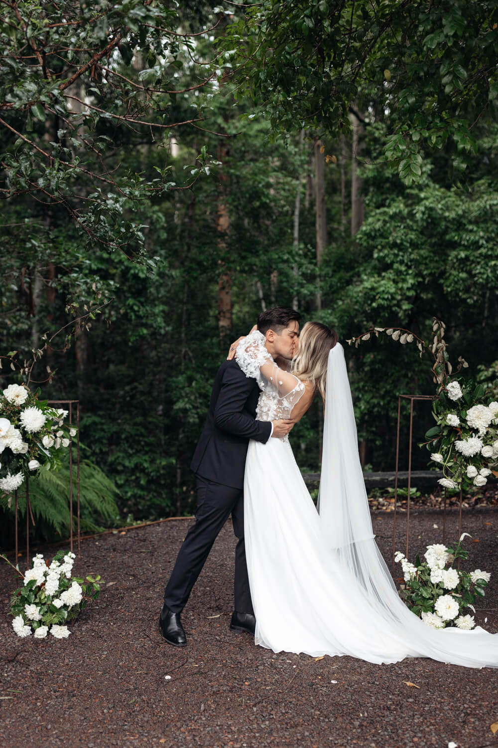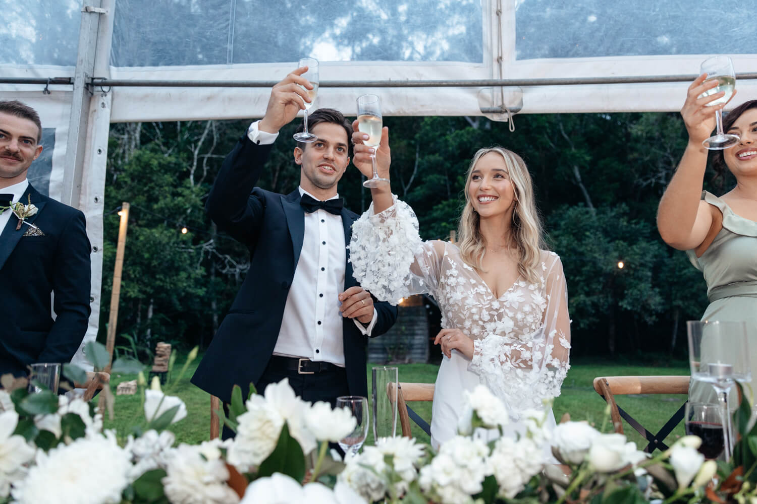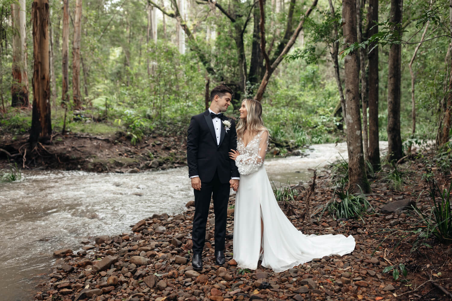 Make-up artist: Make Up By Stevi | Hair stylist: By Jess Monck | Floral designer: The Flower Shop Dungeon | Videographer: Morelife Films | DJ: Rave Tapes | Live music: Tatts And Tea Music | Bride’s dress: Rimearodaky | Bride’s shoes: Nine West | Brides ring designer: James Allen Rings & Matthews Jewellers | Groom’s suit: Uberstone | Groom’s accessories: RM Williams | Caterer: Feast Catering