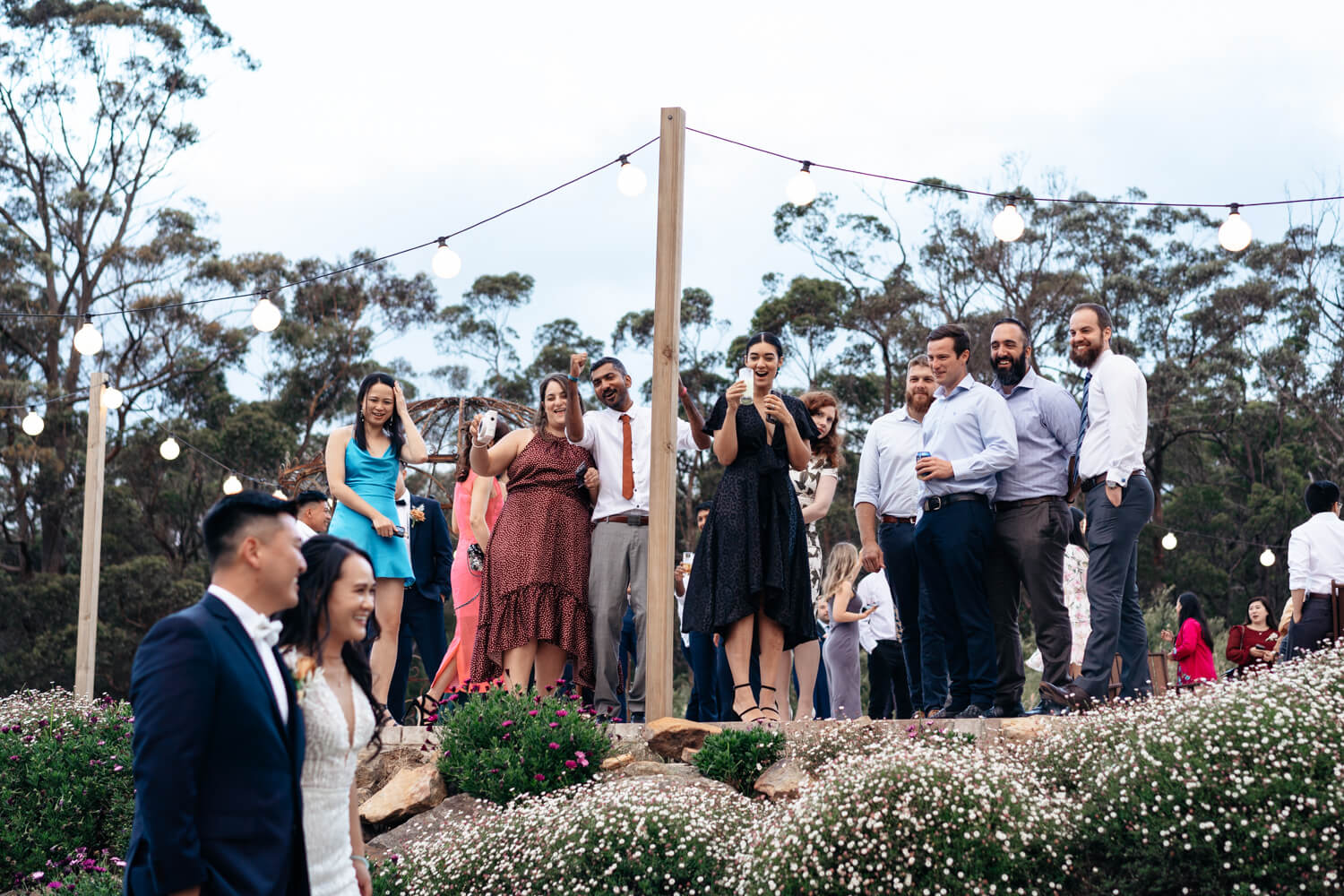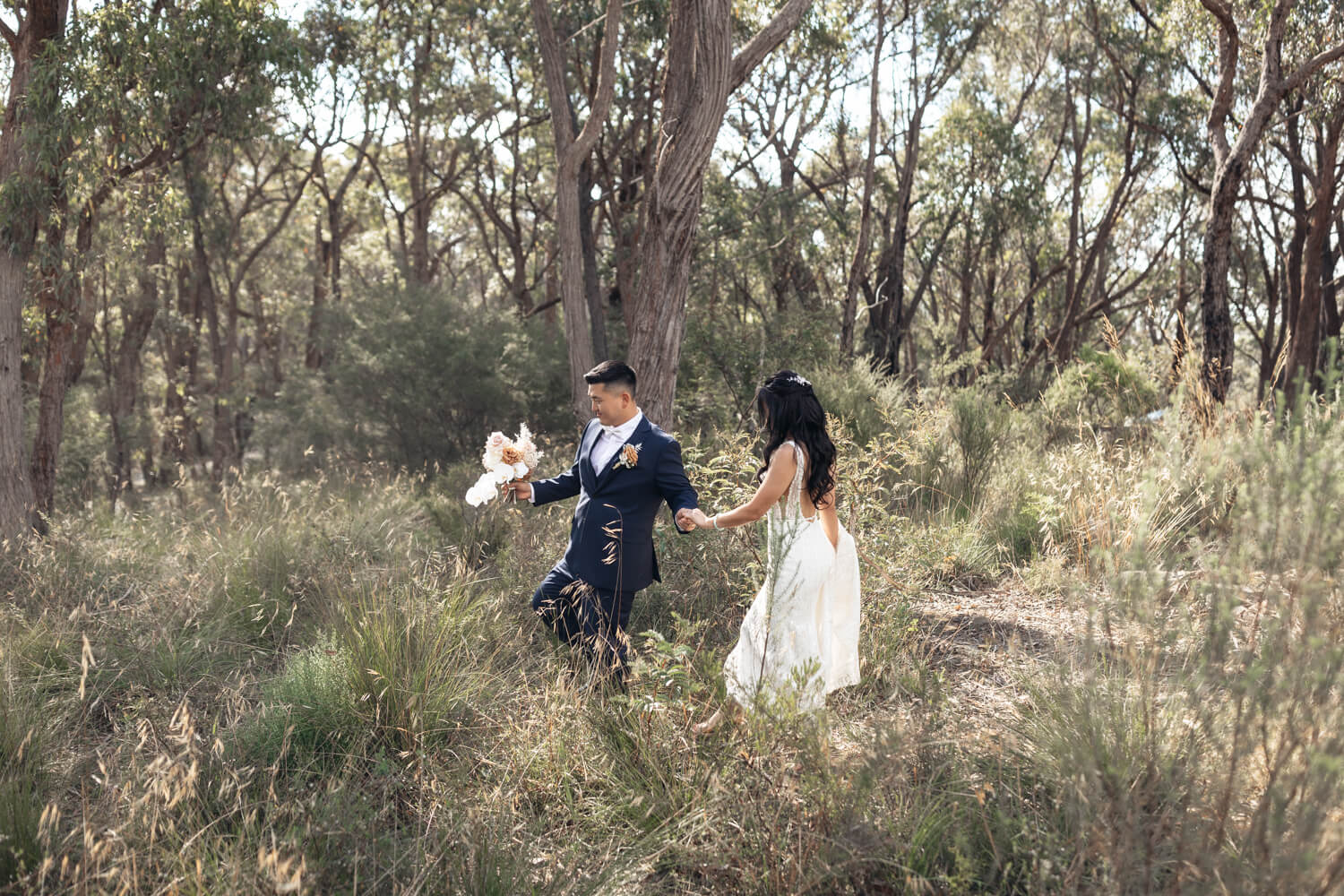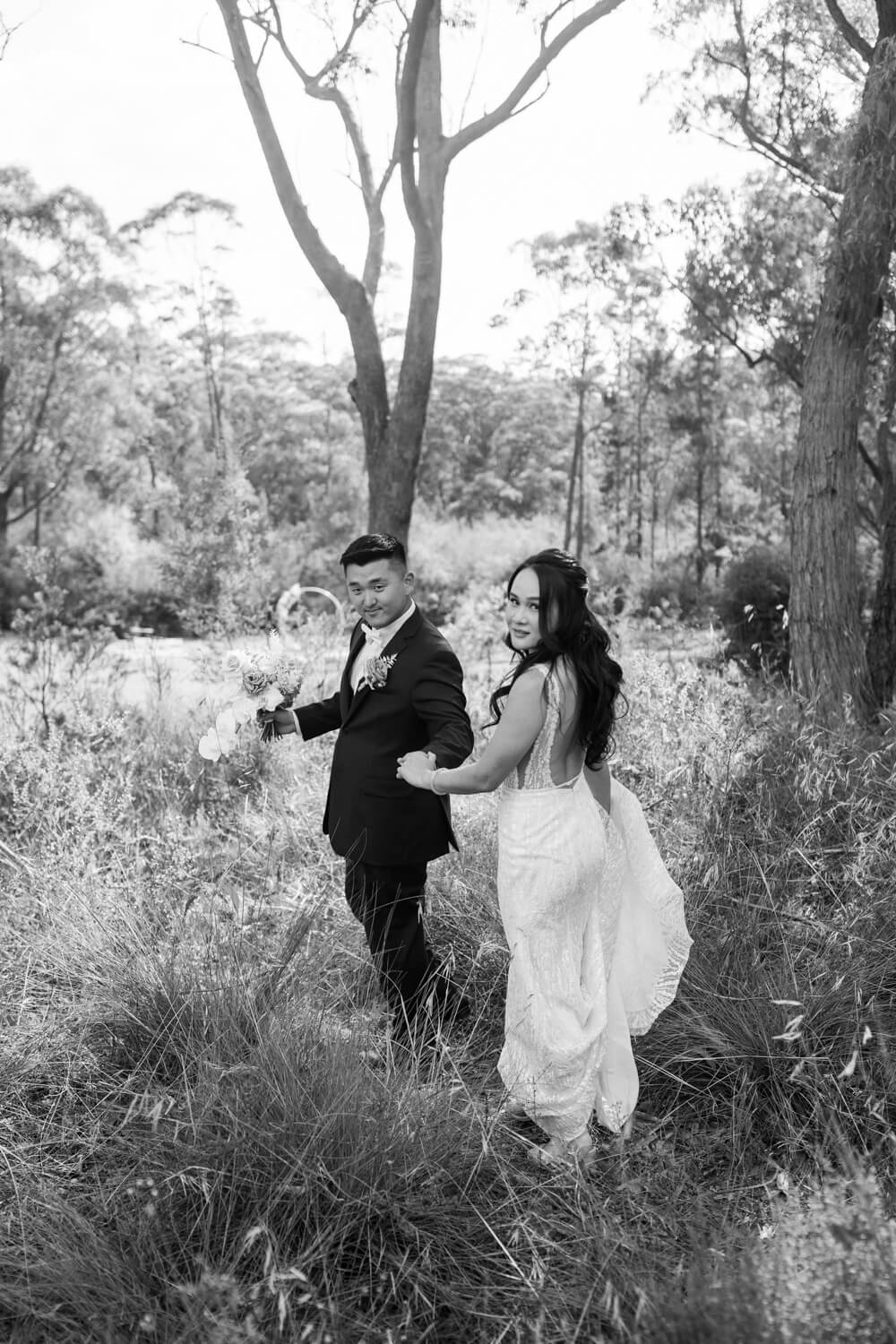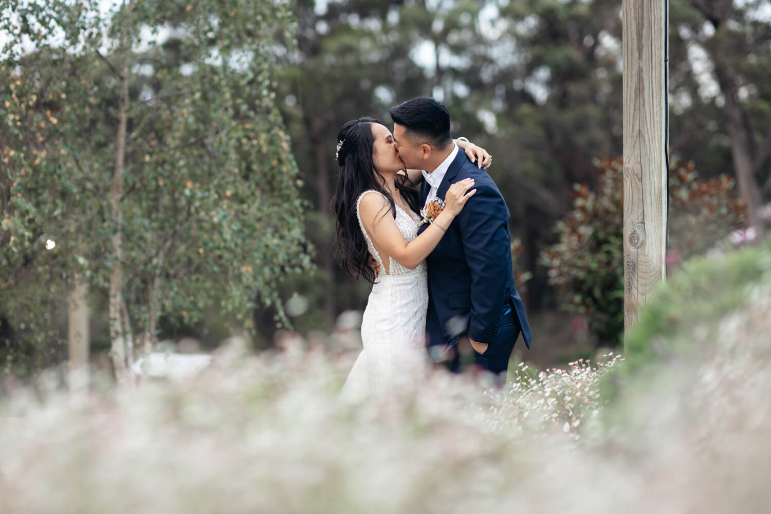 How did the proposal take place that lead to your Growwild Wildflower Farm Wedding in The Southern Highlands?: Sony planned the proposal months in advance and dreamed of the perfect proposal at his favourite lookout place – Blackheath Lookout. However, covid pushed his plans back and mother nature was not kind to him leading up to the big day. We had planned to go camping with our usual camp-crew but torrential rain meant that the team had to look for a new campsite the day before. Jenny was very upset everyone was insisting on going camping when roads and campsites were closed due to flooding. But Sony and the team had a mission and were determined for it to happen, so a very grumpy Jenny sat through the entire drive quietly seething. To top things off… it rained so hard overnight our tent leaked and pooled water all night… When the weather cleared up in the morning, Sony bailed out the pool in the tent while Jenny sat watching with a ‘I told you so’ look on her face. We headed to the Lookout in the afternoon and with the help of their sneaky friends, Sony was able to surprise Jenny with a proposal in front of the misty valley. Jenny’s first words as he reached into his pocket was ‘Are you serious?’. Sony’s mind blanked and he forgot everything he had planned to say…