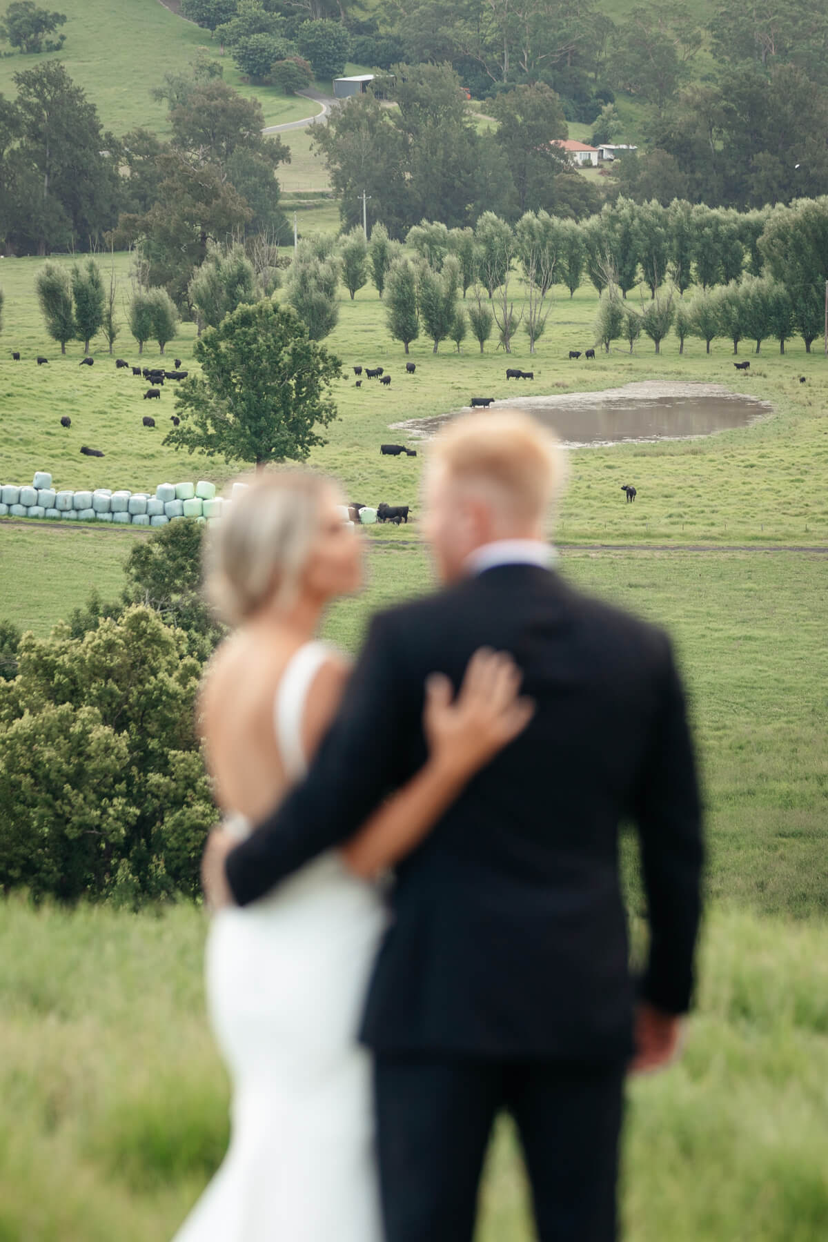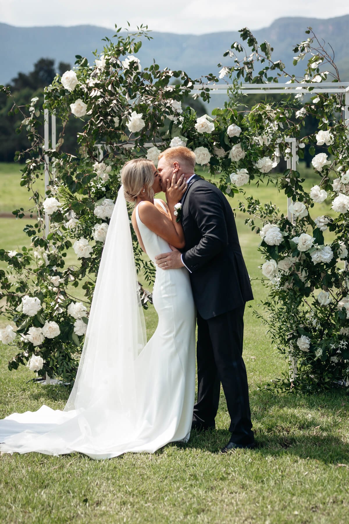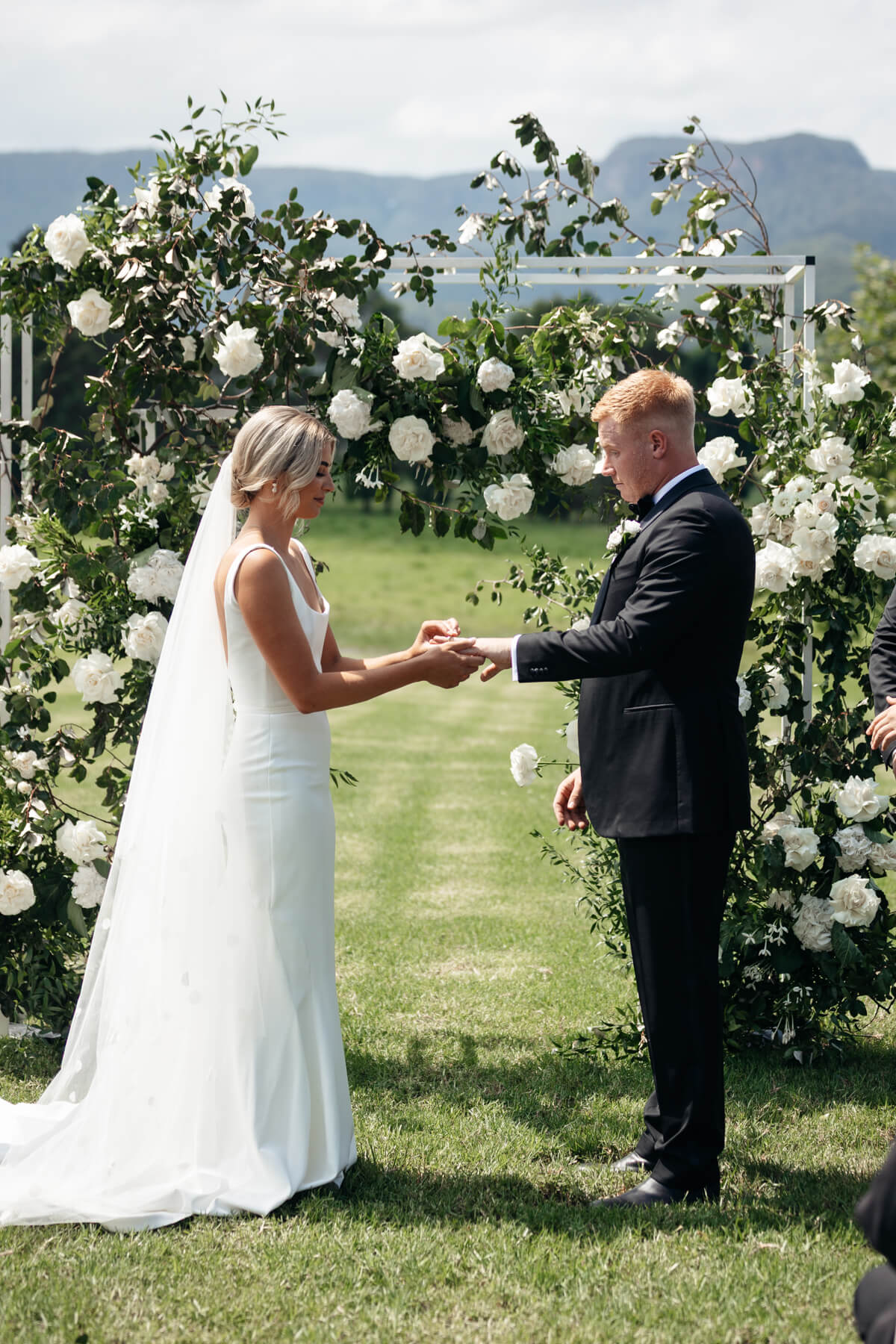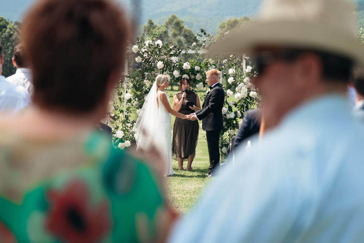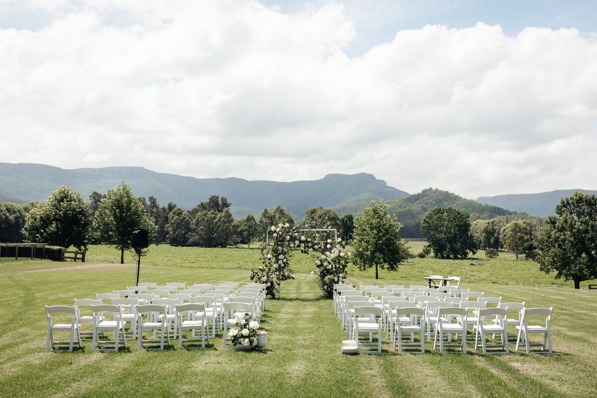 One of the defining features of a Kangaroo Valley wedding is the landscape itself. At Melross Farm, ceremonies typically take place overlooking wide-open paddocks framed by dramatic mountain backdrops. There’s a stillness to the valley that’s hard to describe until you experience it. No traffic noise, no distractions, just open air, birdsong, and that soft golden light the region is known for. It creates a ceremony that feels grounded and intentional, without needing to be over-styled.