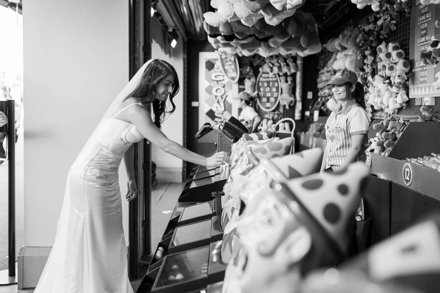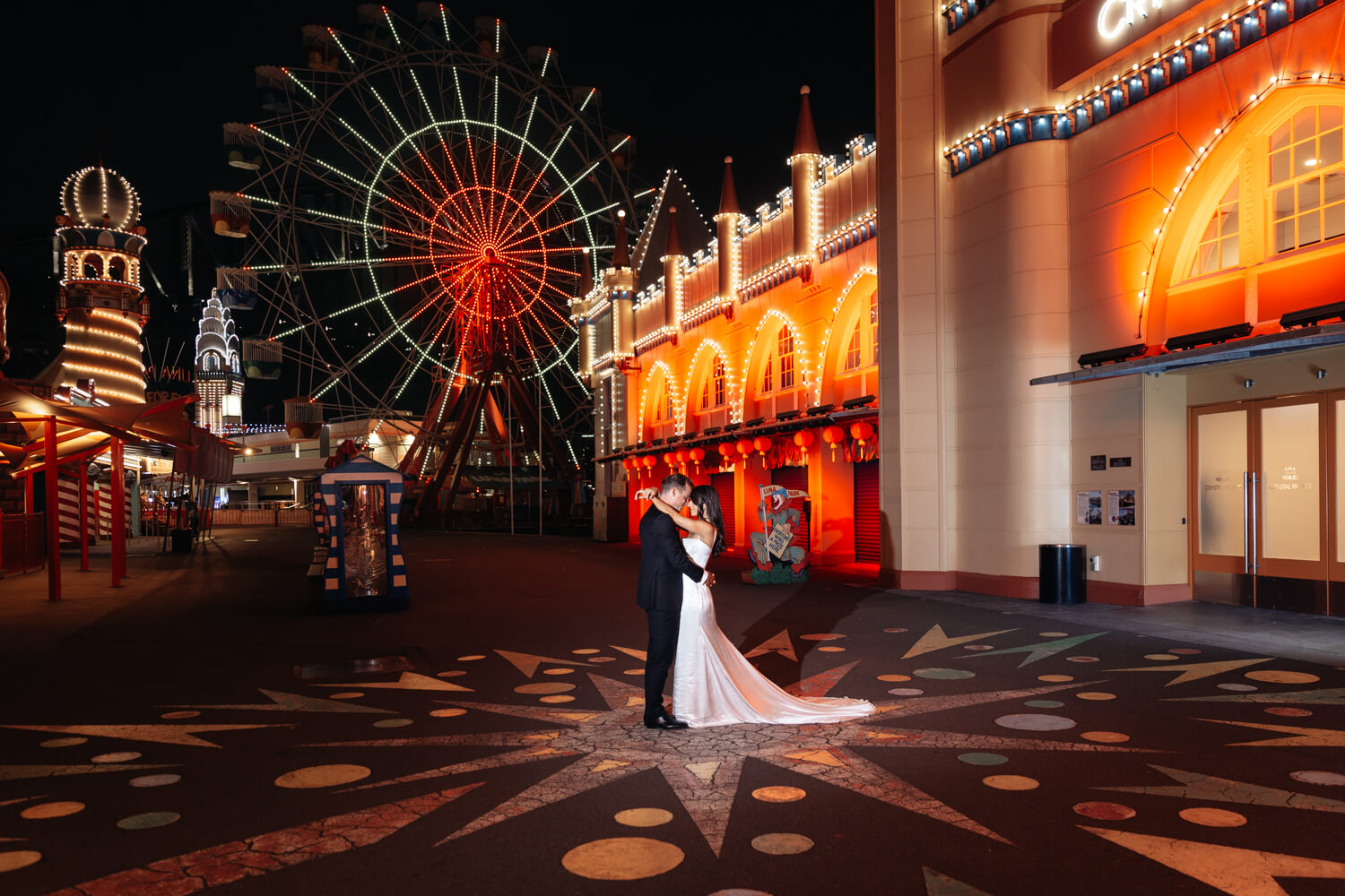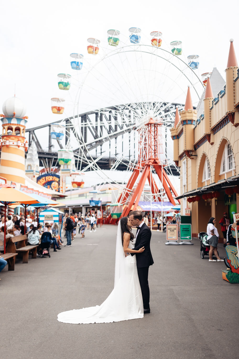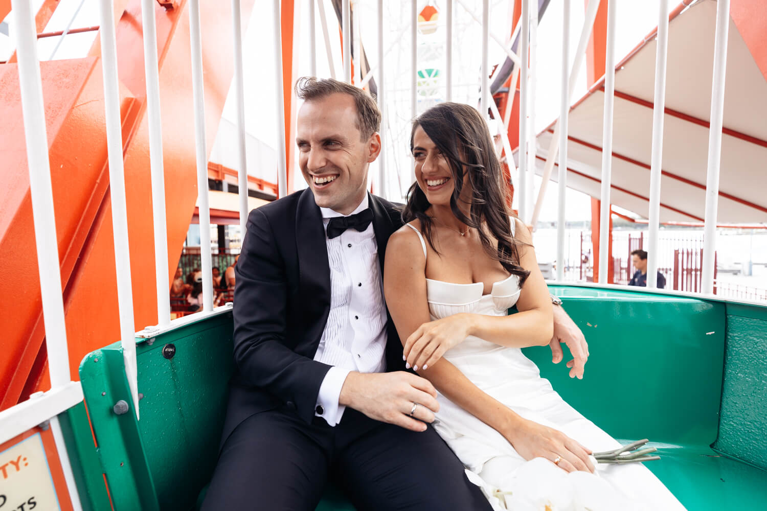 Why did you select Luna Park for your wedding?: Nick loves the position right on the harbour and the room’s very large windows and high ceilings. Madeleine was hooked by the ‘Brides on Rides’ offering at Luna Park – the day can be stressful enough so will be nice to have some fun and laugh at ourselves in between the formalities.