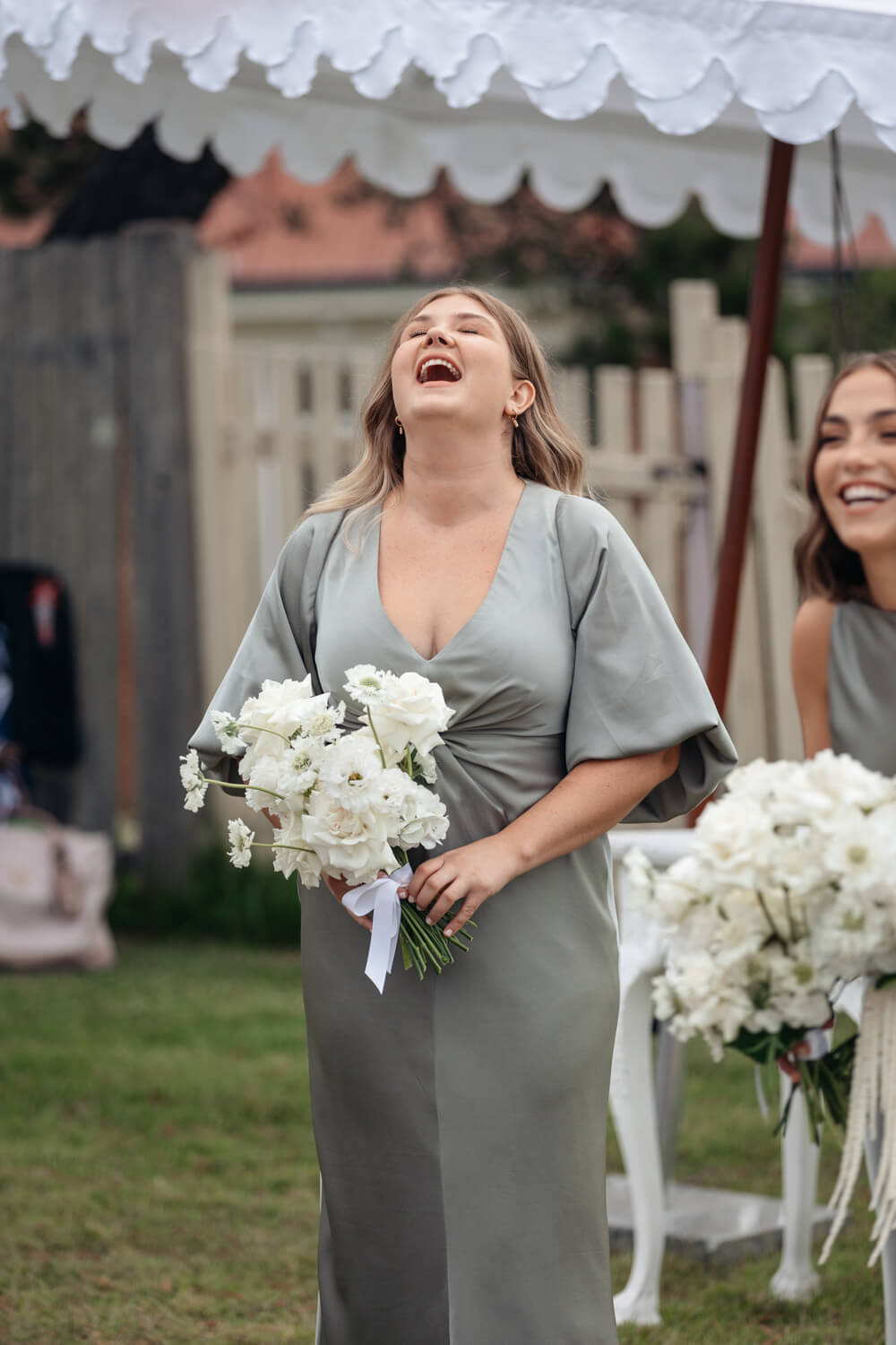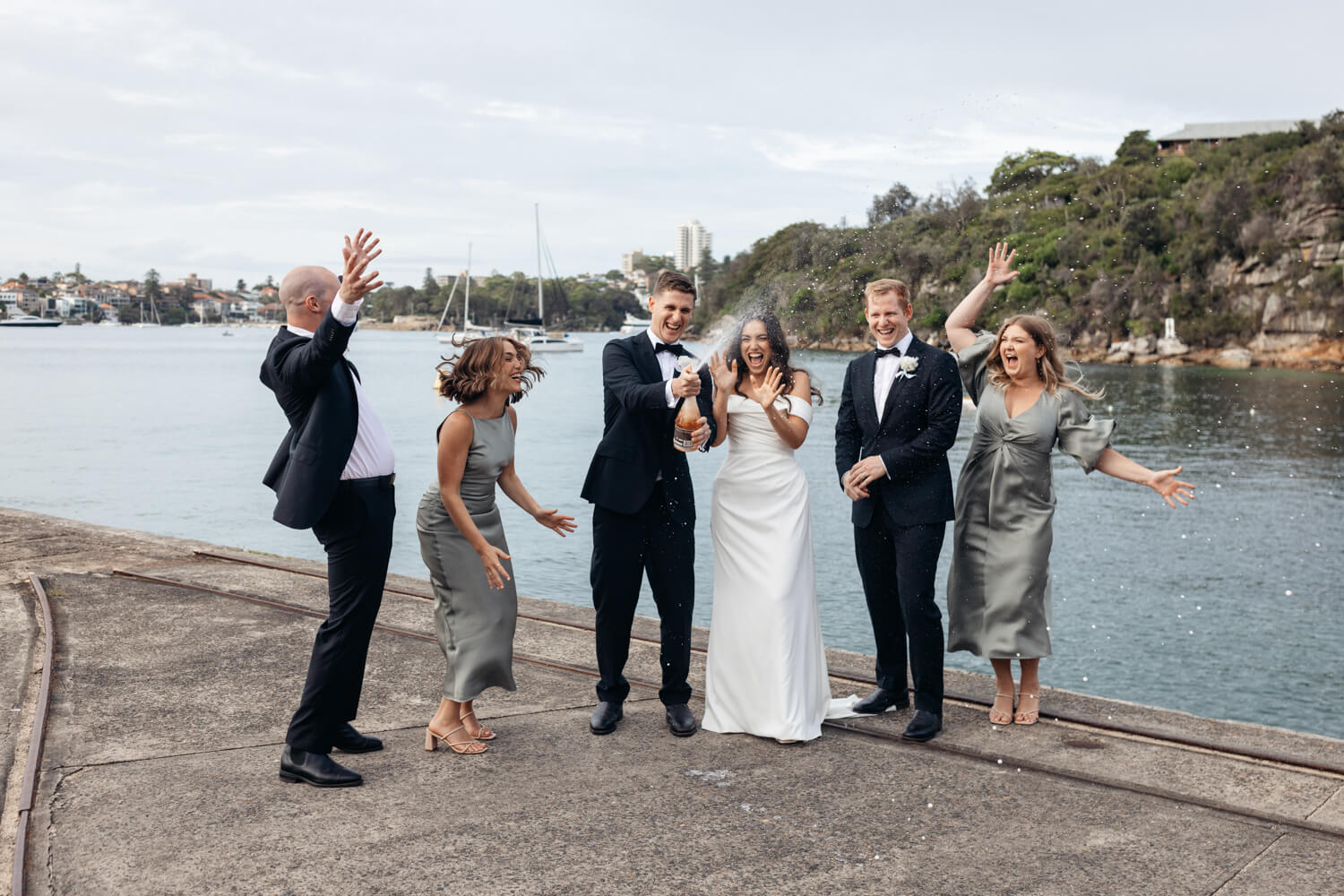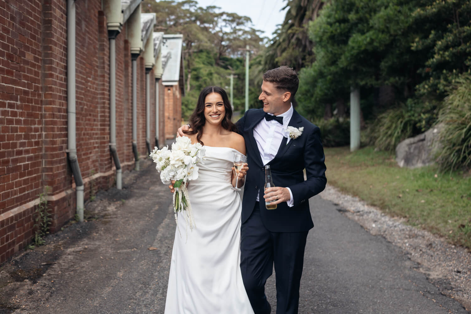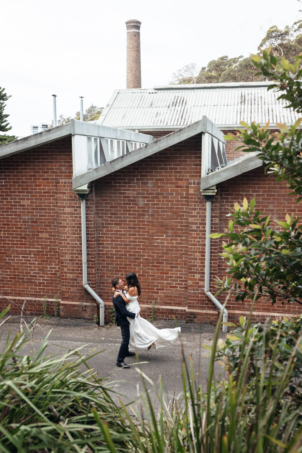 Afterwards, we wandered the grounds for photos. Q Station’s mix of lush greenery, waterfront jetties and heritage buildings gave us a few simple but striking backdrops, though what really stood out were the couple’s interactions with each other. They couldn’t stop smiling, sharing little jokes and moments of quiet connection. Their bridal party brought the energy too, making the portrait session light-hearted and fun, exactly how it should be.