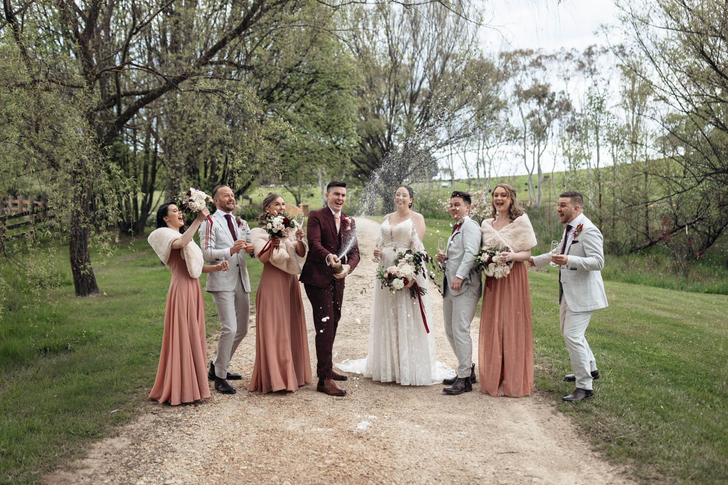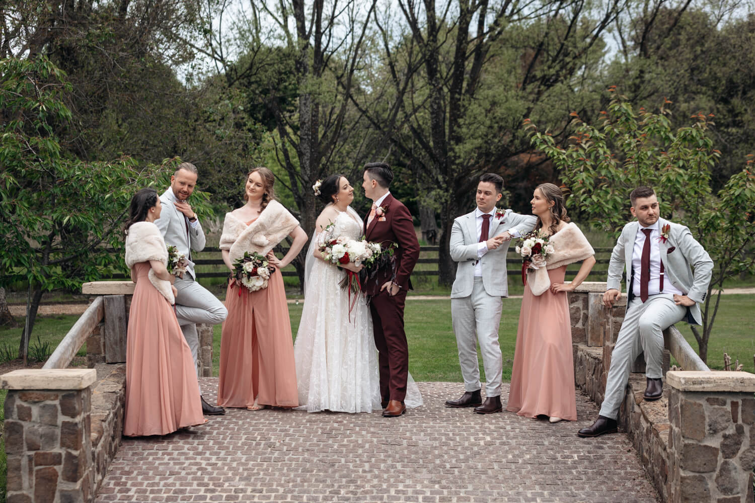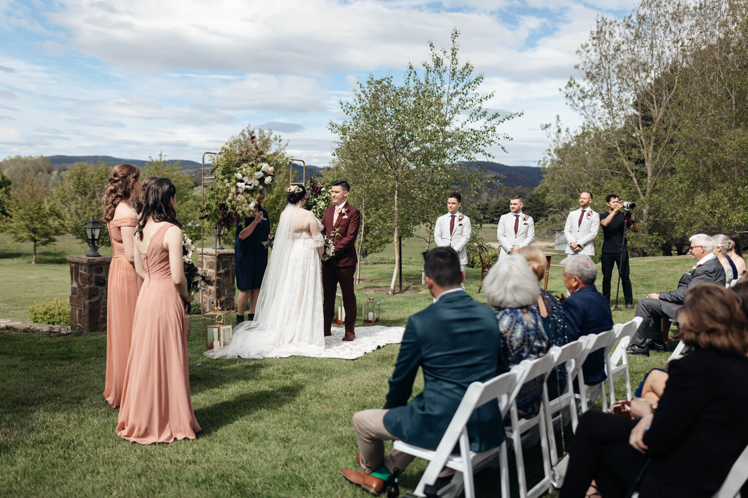 Wedding venue: Waldara Farm, Oberon | Celebrant: Fiona Mason | Make-up artist: Danielle Hampton | Hair stylist: Kellie – Euphoria Hair | Floral designer: Olivia – Flowers at Kirribilli | Cake designer: Beck – Half Baked Moose | Live music: Jess and Matt – Oberon Lane | Bride’s dress: Luv Bridal | Hair piece: Olivia – Flowers at Kirribilli | Ring designer: Natalie Marie Jewellery | Bridesmaid dresses: Oleg Cassini | Groom’s suit: Bentex Suits | Groom’s accessories: Peggy and Finn | Groomsmen’s suit details: MJ Bale | Invitation designer: Paradise Invitations
